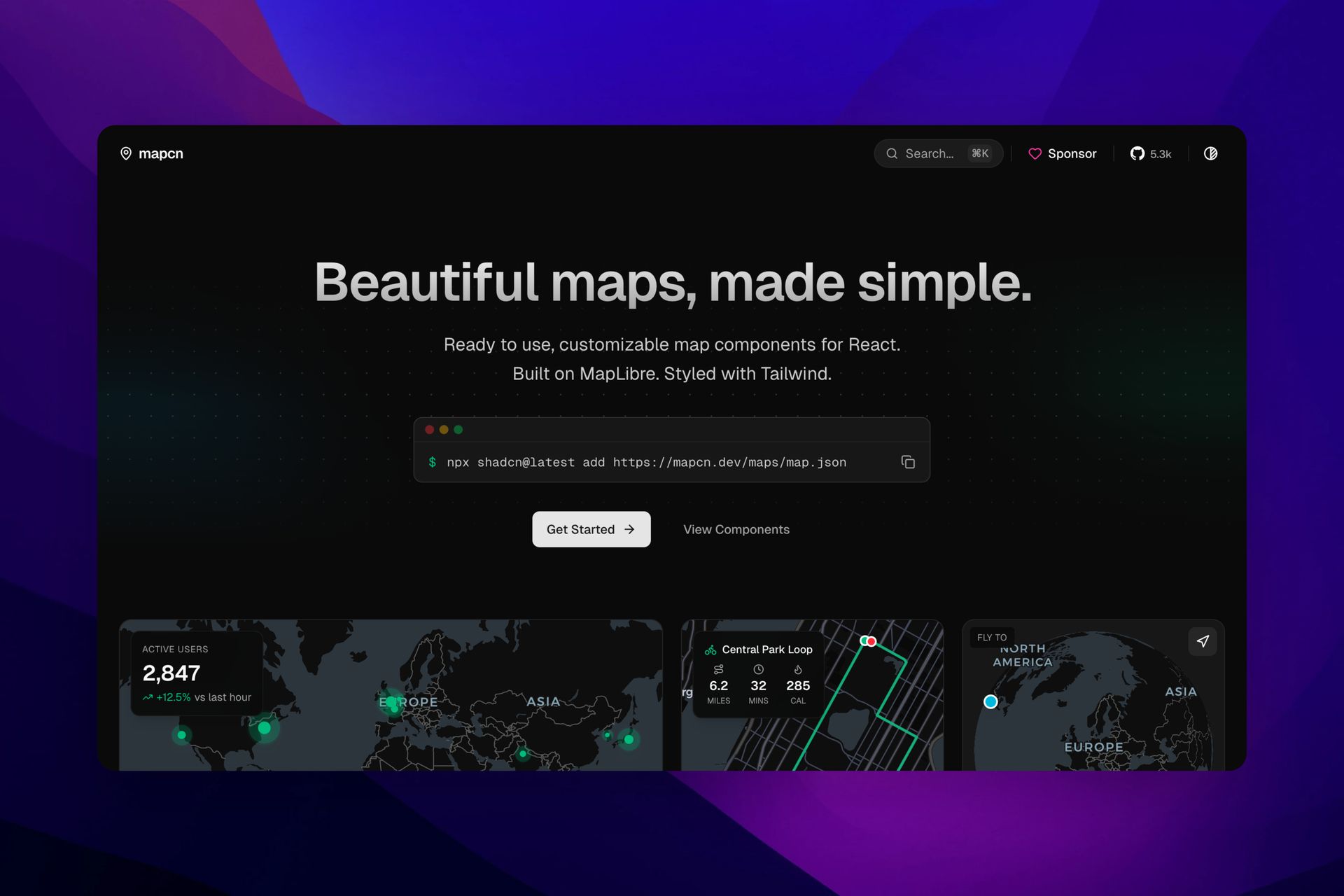 MapCN provides open-source, composable map components that you can drop into modern web apps with minimal setup. Built on MapLibre GL and styled for Tailwind/shadcn-based projects, it lets you add interactive maps, markers, popups and routes with a one-command install and zero configuration.