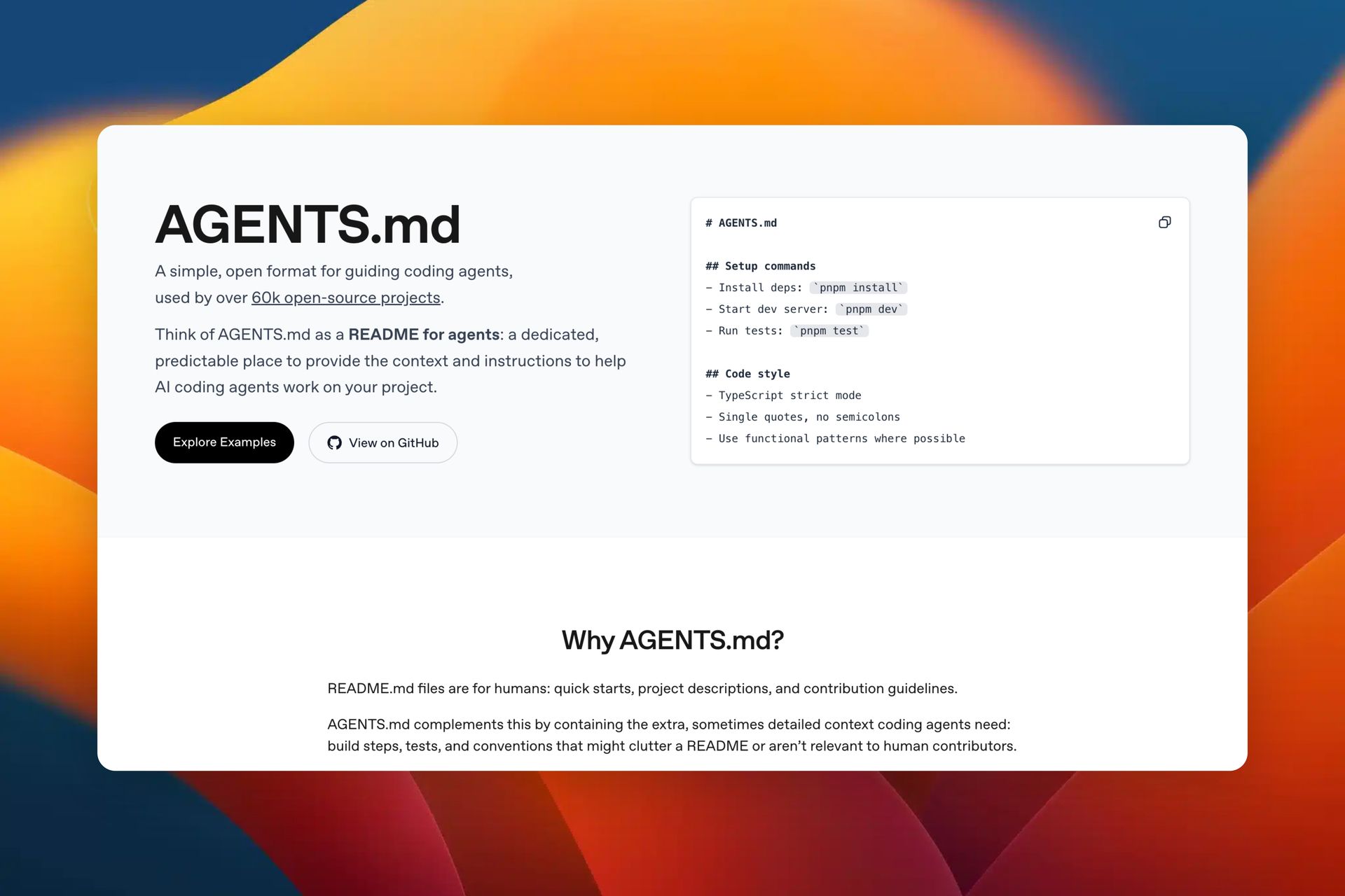 AGENTS.md is an open, Markdown-based format that acts like a βREADME for AI coding agents,β guiding them through project setup, build steps, tests and conventions. Used by a growing number of open-source projects, it gives AI assistants clear, structured instructions so they can work more effectively without cluttering human-focused docs.